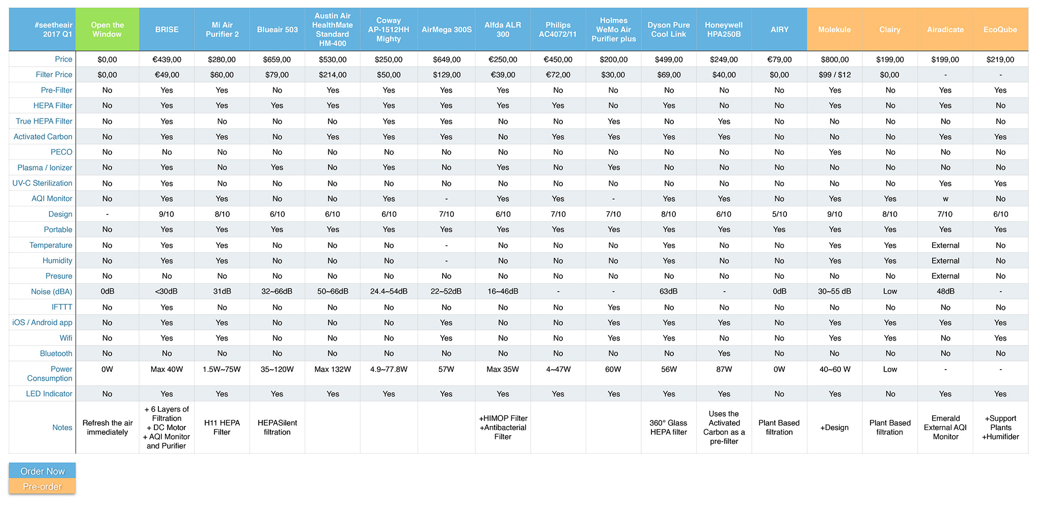 2017 New Air Purifiers in the market that use new ideas and technologies to clean the air from VOCs to PMs. As you can see on the green column I have mentioned the best and the cheapest way to improve air quality indoors, it’s a reminder for those that can apply this principle and when the outdoor air is cleaner than the indoor.