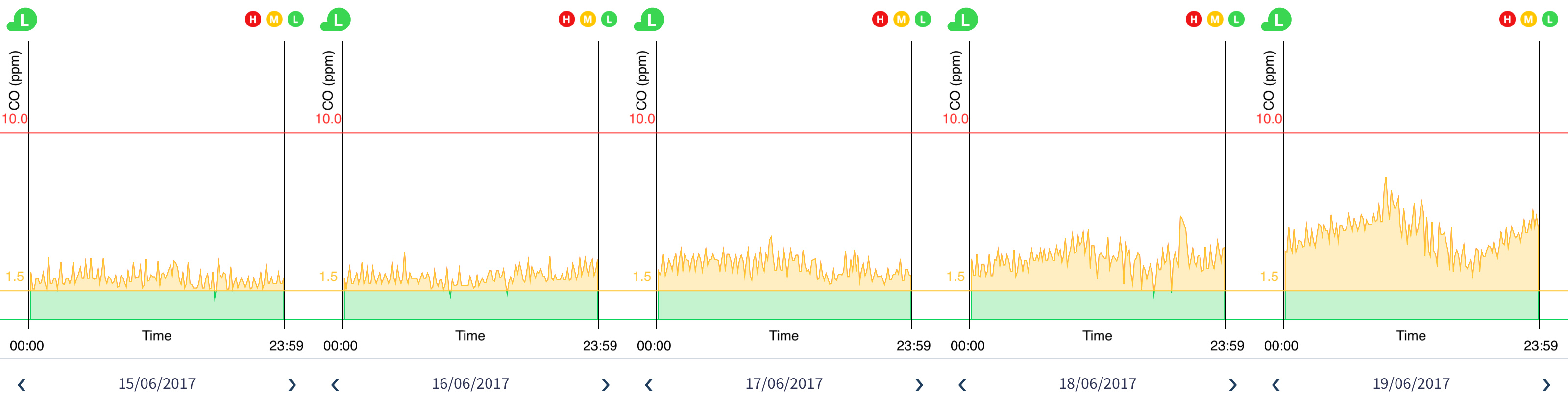 On the graphs below you can see the air quality during the 5 days in the NY City. The first day on 15th June I was mainly on the 5th avenue visiting the Rockefeller Center, the New York Public Library, the Grand Central Terminal and the Chrysler Building on the 3rd avenue. Finally during the afternoon I was on the Greenwich Village and One World Observatory Building. A small amount of CO in the atmosphere, but in my opinion nothing to worry about. The weather was sunny and a bit windy at 16 km/h (SSE).