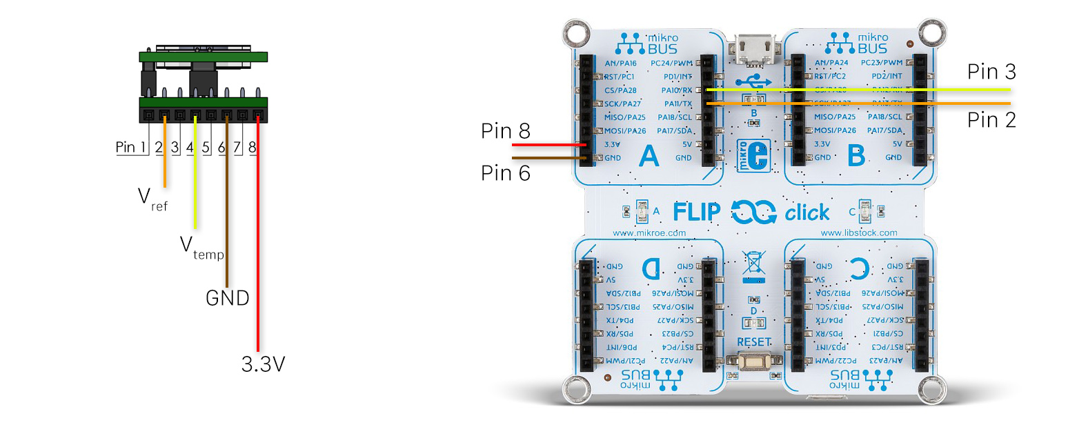 Firstly, you will need to connect the microSD click board to the mikroBUS socket D and insert the microSD card of your choice, this is an easy step but remember if you connect the click board on a different socket it won’t work. Then you will need to connect the DGS-NO2 with the help of 4 Dupont Male-Male cables to the mikroBUS socket A as the diagram explains below (click to enlarge).