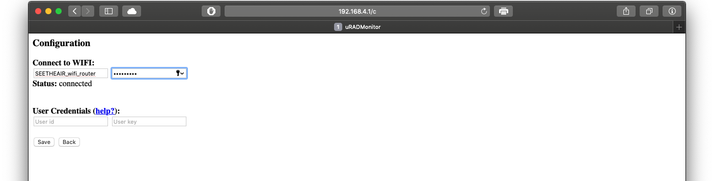 Inside the Connect to WIFI add the information of your router WiFi, the SSID and the password and click Save. Disconnect your computer or tablet or phone from the uRADMonitor-XX SSID and you are ready. Congratulations your air quality monitor is up and running.