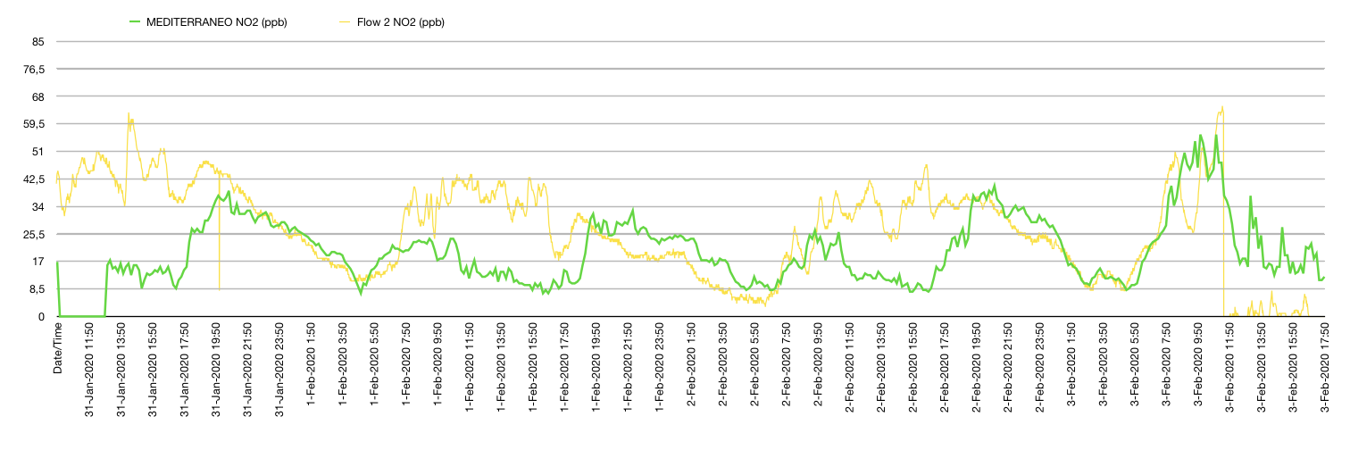 Let’s begin with the comparison of the NO2 gas sensor inside the Flow 2 and the reference monitor Teledyne Model 200E. The official measurements were in μg/m3 so I had to convert them into parts per billion (ppb). Converting the original values to ppb is not an easy task as you have to know the molecular weight of the pollutants (NO2=46.0055g/mol) and most importantly the temperature and atmospheric pressure at the time each value was taken, the problem was that they didn’t provide me with that data and I didn’t have them either. As a result, I looked them up and the average values were 15°C/59°F and 1019hPa, so to simplify my workflow I used those numbers in the formula for all the conversions. I know, I know, the data from the reference monitor are not 100% correct now but they are very close so they will do the trick.