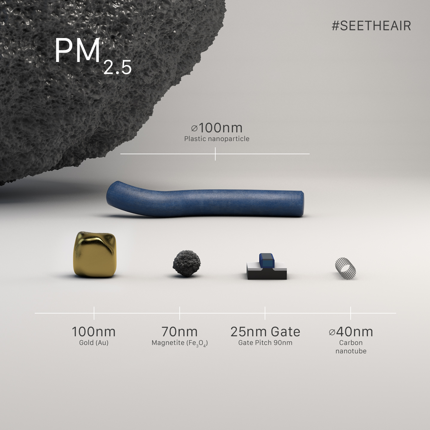 PM2.5 is around 2,500 nanometers (nm) in diameter. However, nanoparticles are 100nm (0.1μm) or less. In comparison, they are 25 times smaller, as a result, they can reach any organ in our bodies.