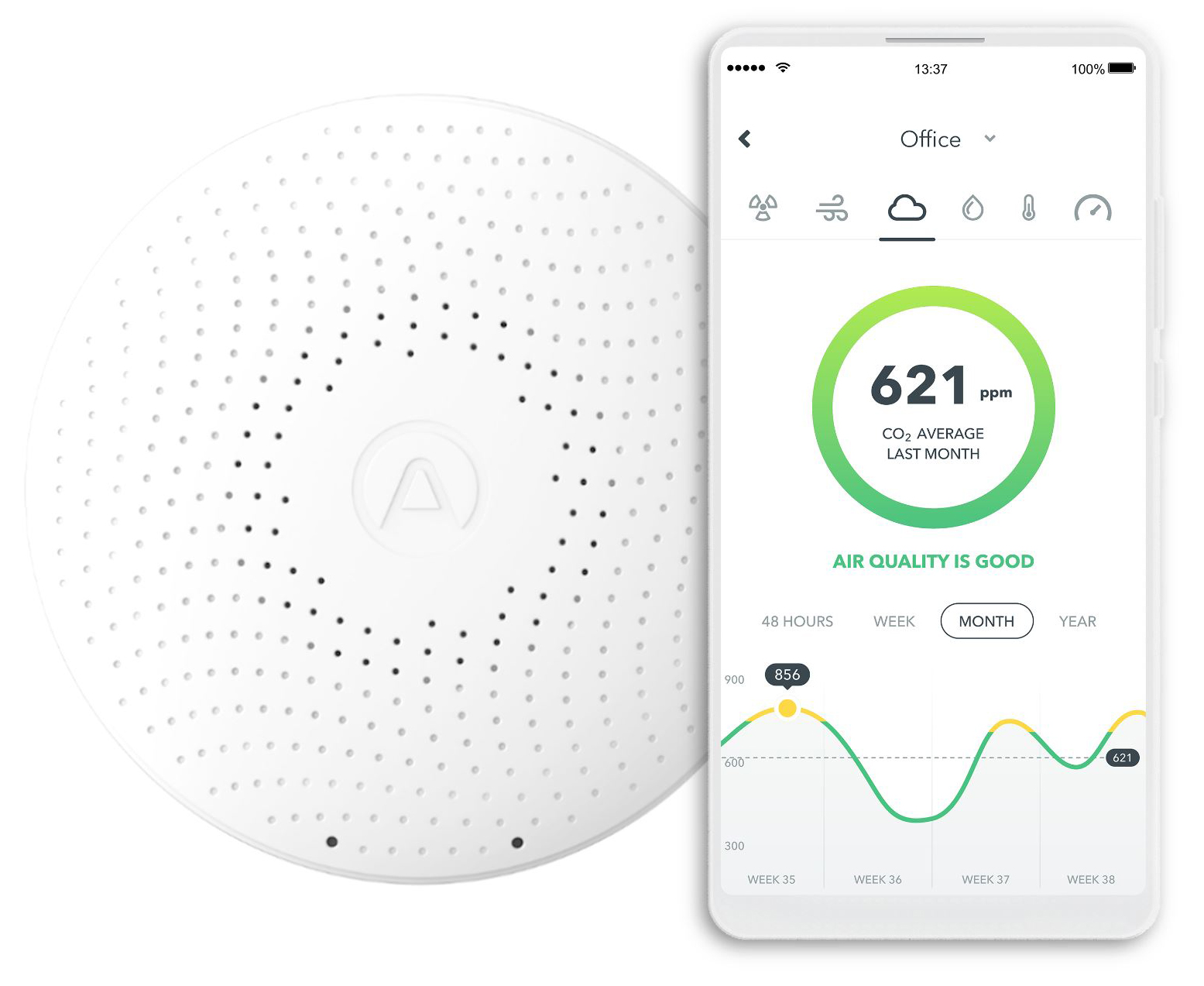 Airthings Wave Plus features a very low power Senseair CO2 sensors. Additionally, it has a Radon sensor, a VOC sensor, and a temperature/humidity/atmospheric pressure sensor. It can operate up to 6 months with just two AA batteries, and it communicates with your smartphone via Bluetooth. Recently, the company has released a QR code based cards that anyone can scan and see the AQ for a particular monitor.