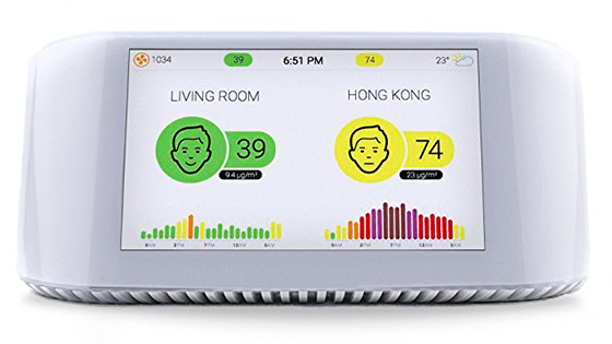 The AirVisual monitor has a CO2, PM2.5/PM10, temperature, and humidity sensors. It has a big LCD display and a battery which allows you to move the device around for a few hours.