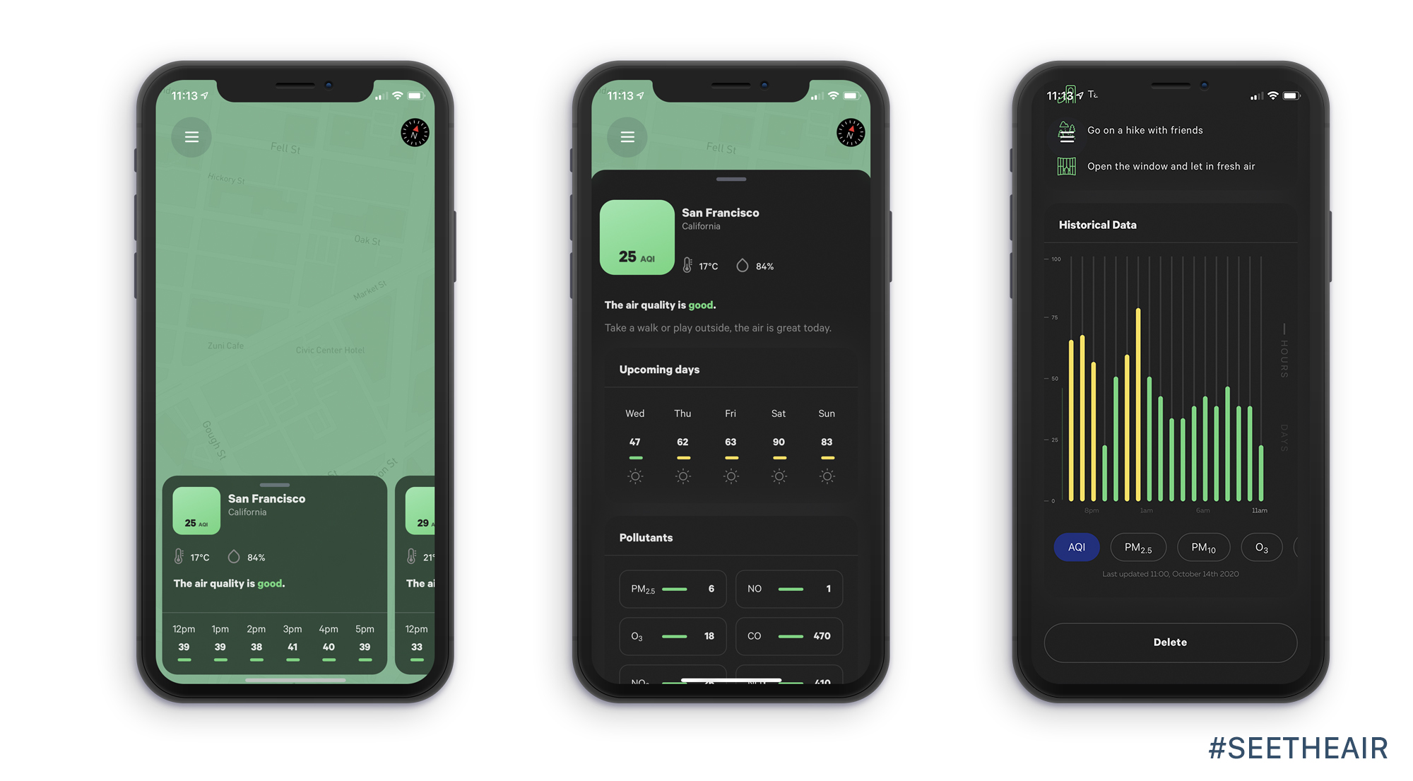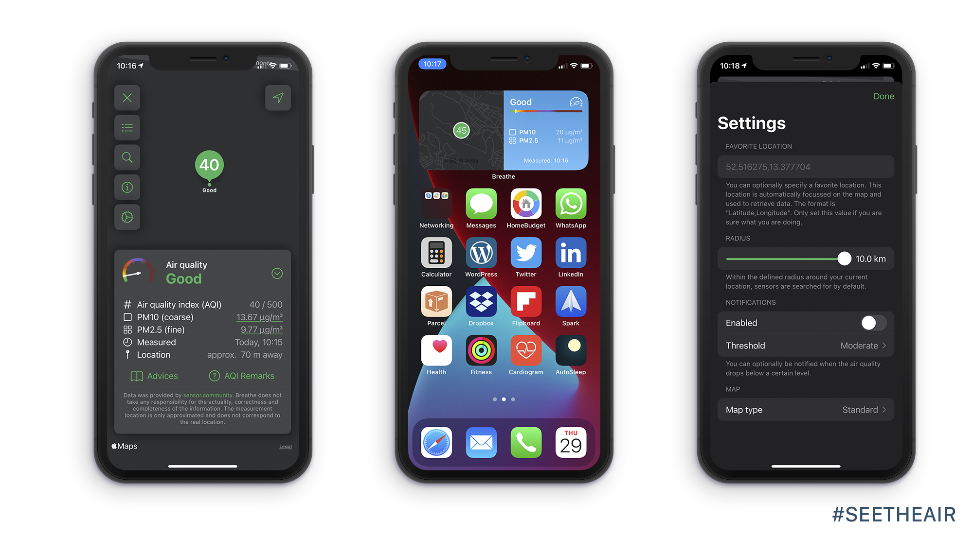Although Airly app was designed to support the Airly air quality monitors, it also supports PupleAir monitors and EPA stations and it is powered by Dark Sky service which was recently bought by Apple Inc. It supports dark mode and it is compatible with the US EPA AQI and the European AQI CAQI. Very fast responding app and visually pleasing.