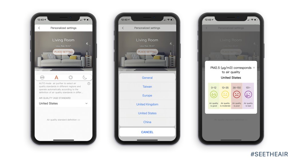 BRISE also take PM2.5 pollution seriously and sets higher standards regarding what is considered safe, when PM2.5 levels reach 12μg/m3, it will increase filtration speed to maintain the best air quality for you. Other cheap manufactures consider safe concentrations up to 50μg/m3 or even 75μg/m3 and they don’t offer any kind of warning to the users. The app allows you to swap and choose the best AQ standards for you.