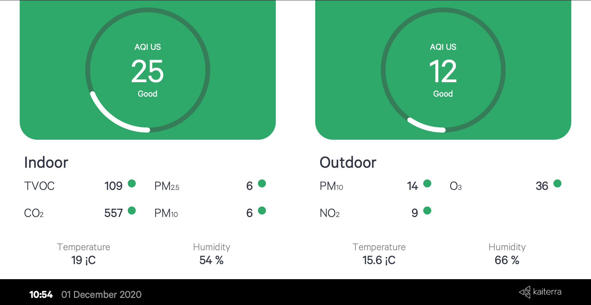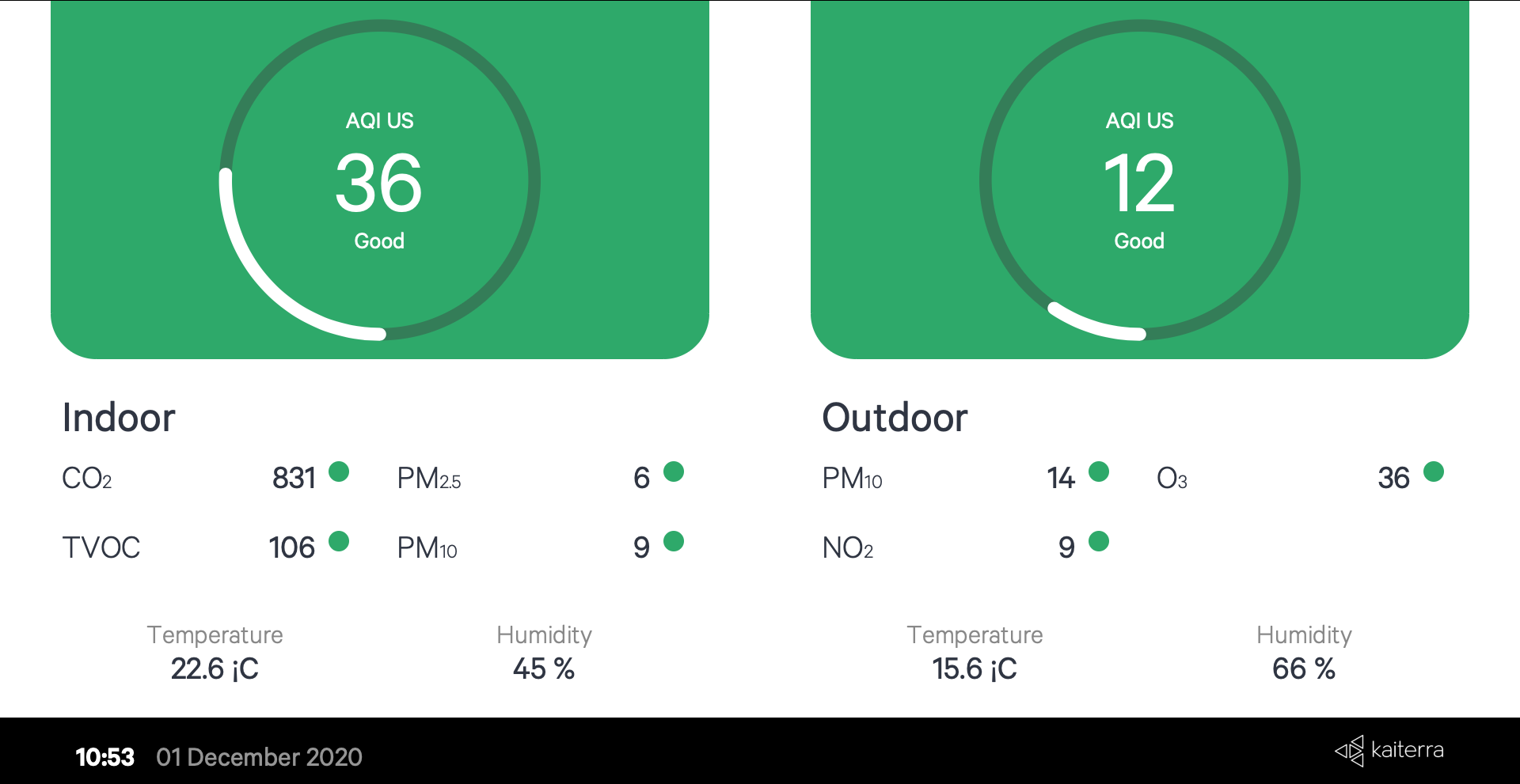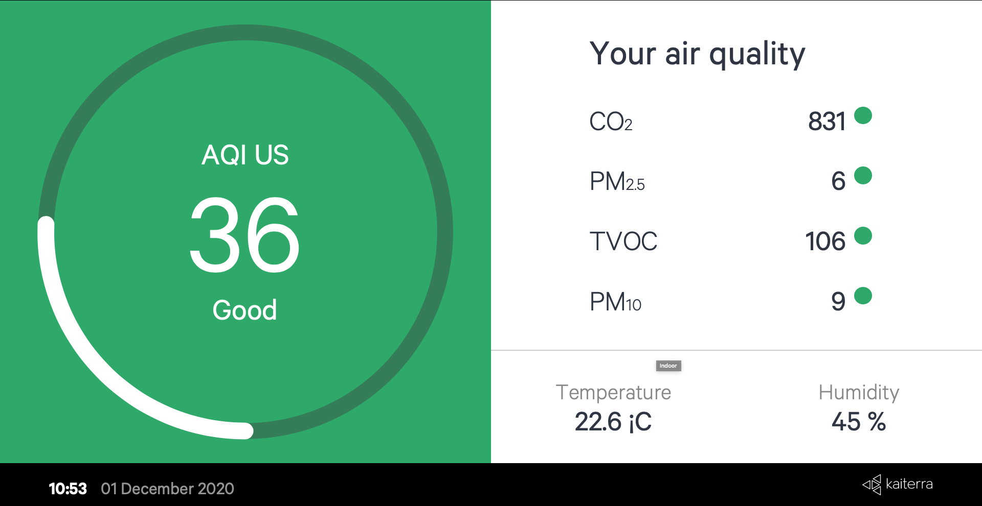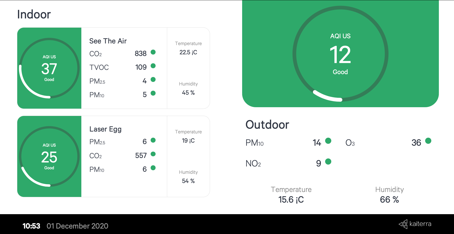 Kiosk View where users can create public URLs in order to display air quality information in buildings, for example, in the lobby of a hotel or at the front desk of an office building as it is required by some Green Building certifications. You can merge all available monitors or have separate AQ information for each monitor. Finally, there is an option to include the outdoor AQ information too, which is quite handy. Feel free to browse the image gallery below with all the combinations.