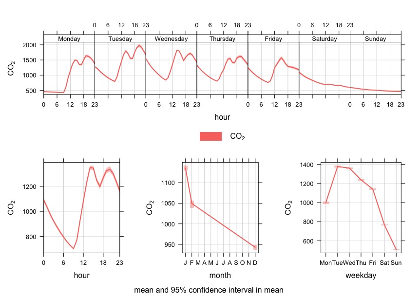 Once the employees are inside the office CO2 levels rise and will fall only once they leave for launch and the end of the labor day.