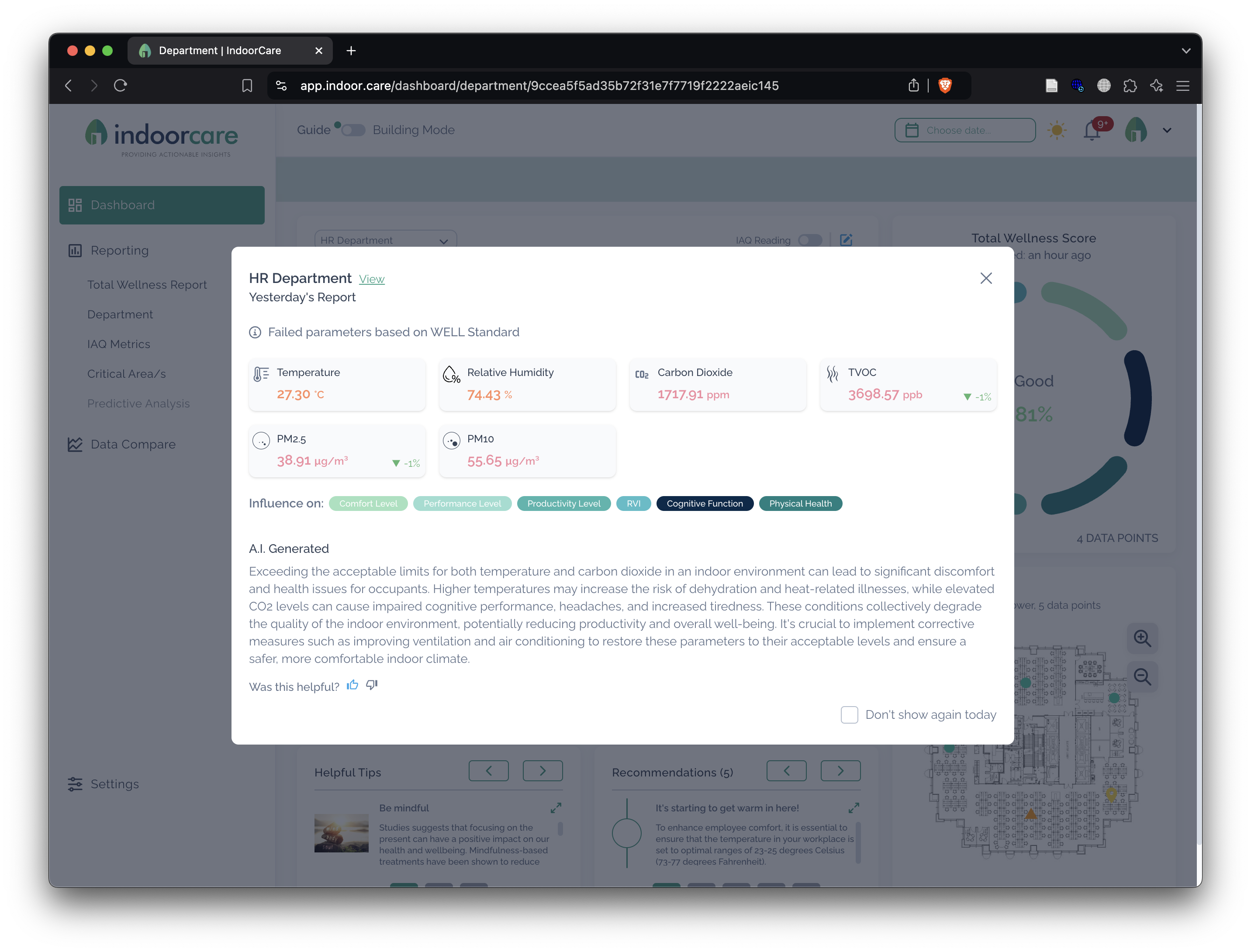 Indoorcare offers a user-friendly dashboard that goes beyond simply displaying air quality readings for PM2.5, CO2, CO, etc. The magic lies in the AI-powered feedback. Users are presented with clear, easy-to-understand metrics like “Comfort Index,” “Cognitive Performance,” and even an “Allergy Risk Meter.” This allows managers to immediately grasp the impact of air quality on building occupants.