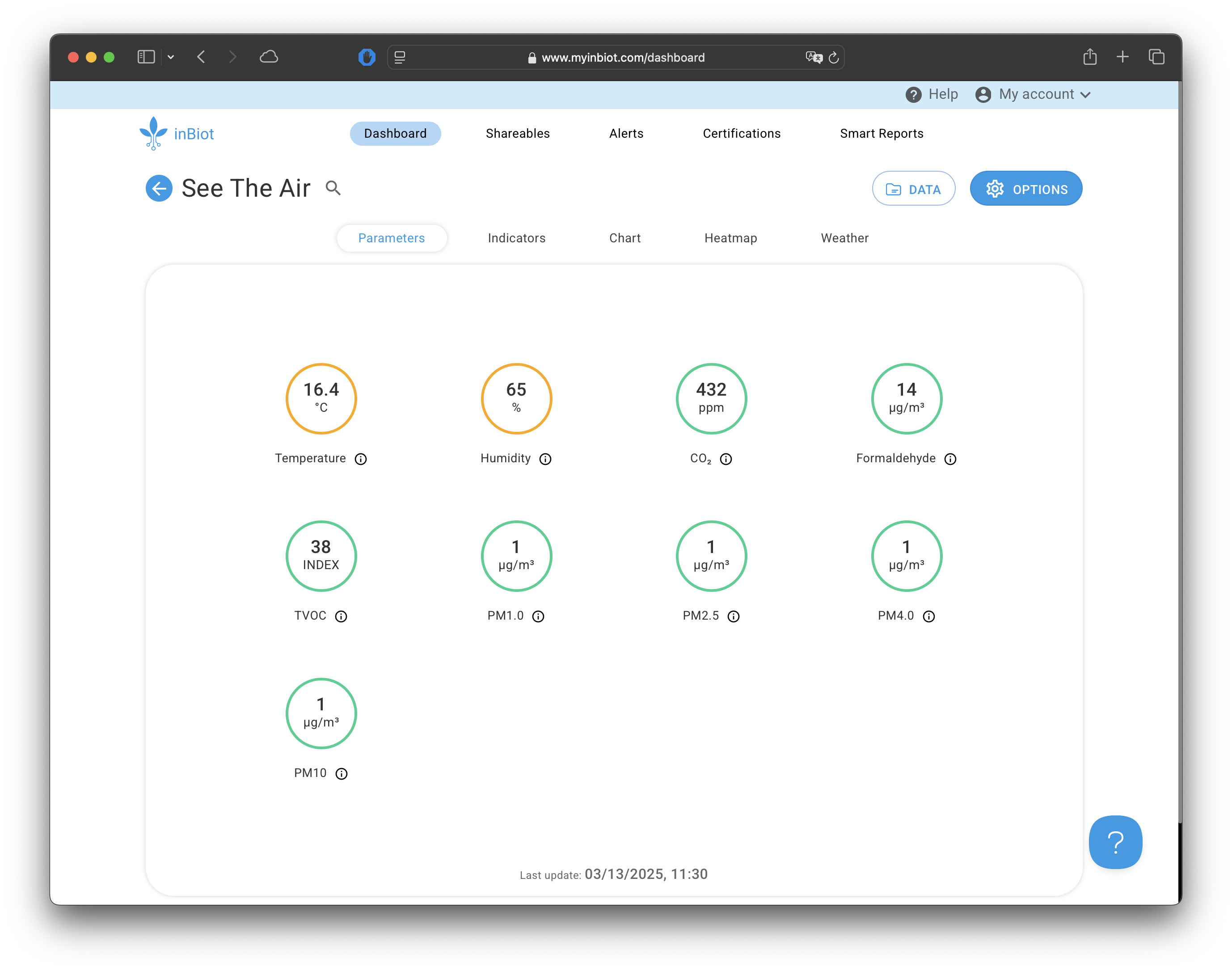 You can download a Sample Report detailing the measured levels of particulate matter, TVOC, formaldehyde, and CO2, providing a snapshot of my home’s IEQ.
