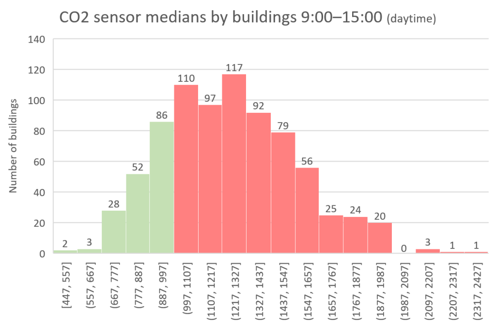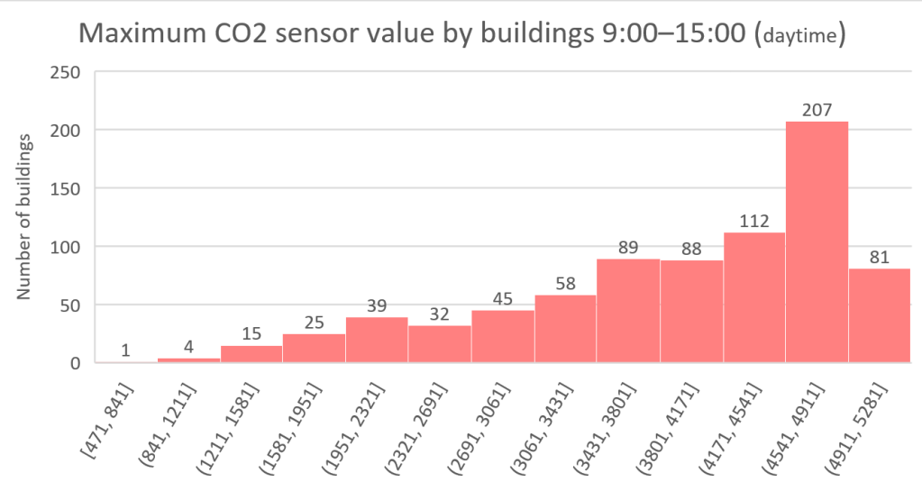 The deployment of these CO2 monitors has also highlighted some limitations and areas for improvement. During the reporting period, installations were still ongoing, and CO2 sensors required a calibration period after installation, which could affect accuracy by 300 ppm or more. Sensors were also installed in various building groups that were not analyzed individually. Notably, healthcare facilities predominantly showed the worst readings, although their proportion among installed meters is small, making the data error acceptable.
