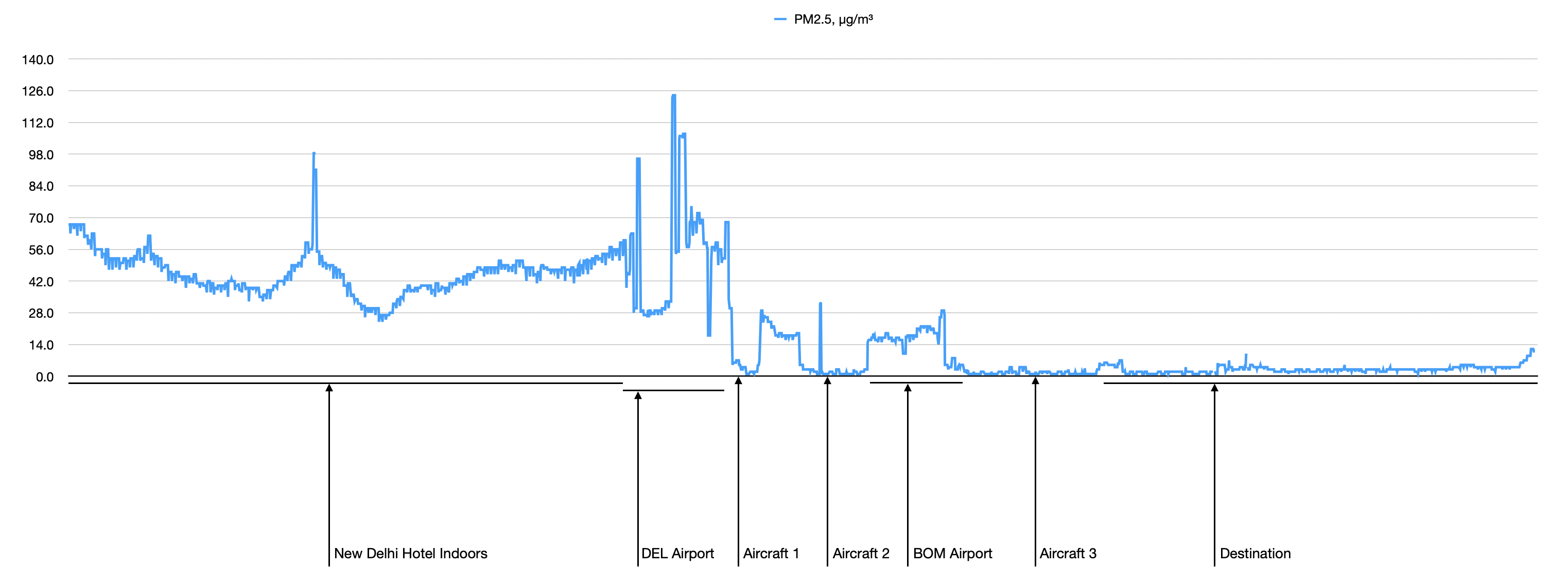 For simplicity, here you can see my PM2.5 exposure for the last date of my trip before coming back home. However, the particle counts for the smaller particles like 0.3μm and 0.5μm, which get lost with mass concentration values, were even higher reaching counts of around 400,000,000 particles per m3 and 40,000,000 particles per m3, respectively. By the way, according to the locals, I visited New Delhi during a good AQ time.