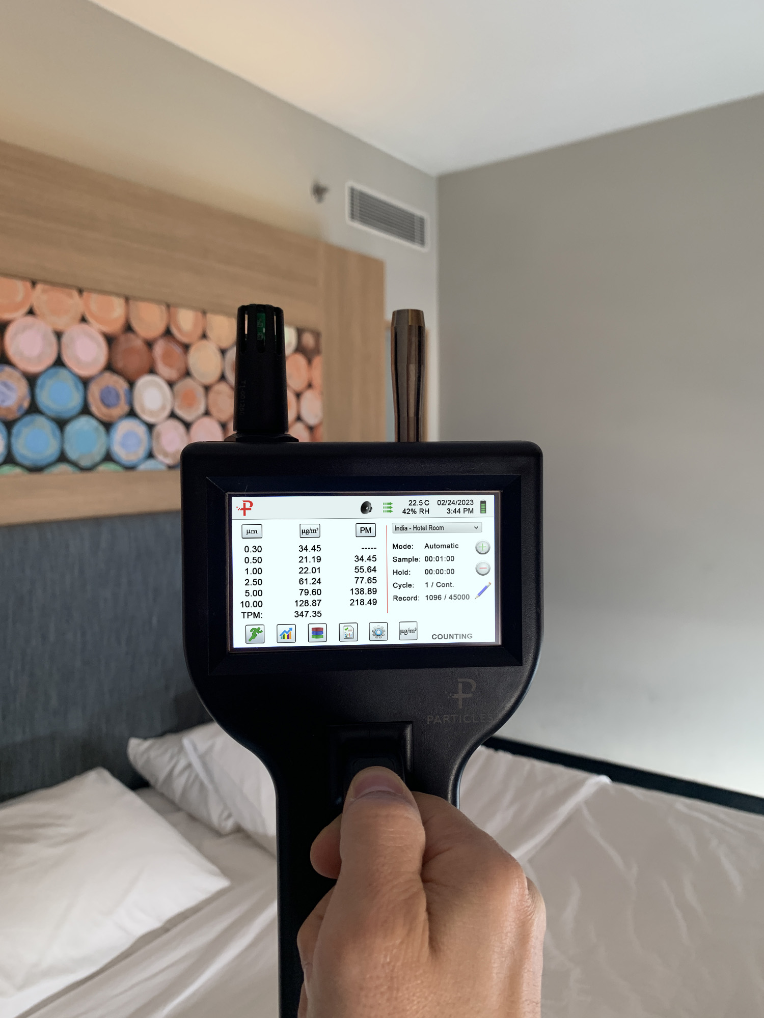 I managed to arrive at the hotel after a small accident with the car (no damages) where I took the air quality monitor out of my luggage in order to measure the conditions in the room. Unfortunately, it wasn’t safe either. The mean PM2.5 concentration during my stay was around 50μg/m3.